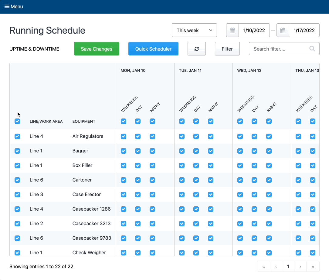 The new Running Schedule page lets you add planned and unplanned downtime with a single tap. This page shows all the lines and equipment in the facility, as well as the available shifts spanning the days that are selected in the date picker.