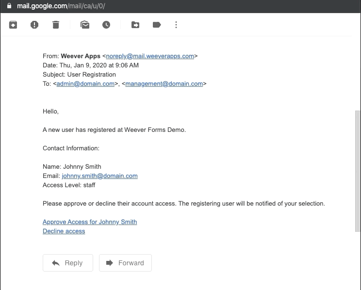 Managers receive an email with the user's information to review. They simply tap a link to approve or decline that account right from their email inbox. The user will receive an email regardless of if their account was approved or declined.