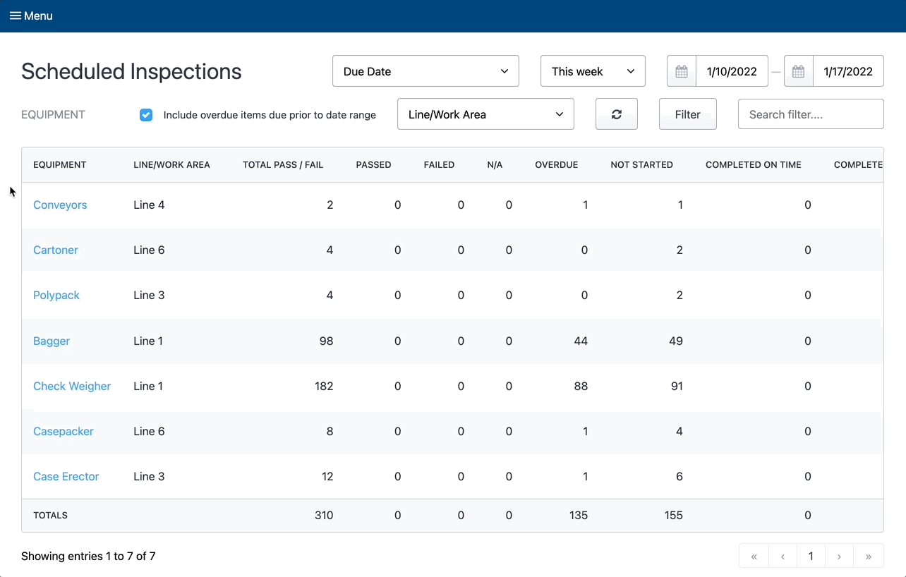- All inspections - This shows a flat list of all inspections in the system (within the selected date range) regardless of assignee, line, or machine.
